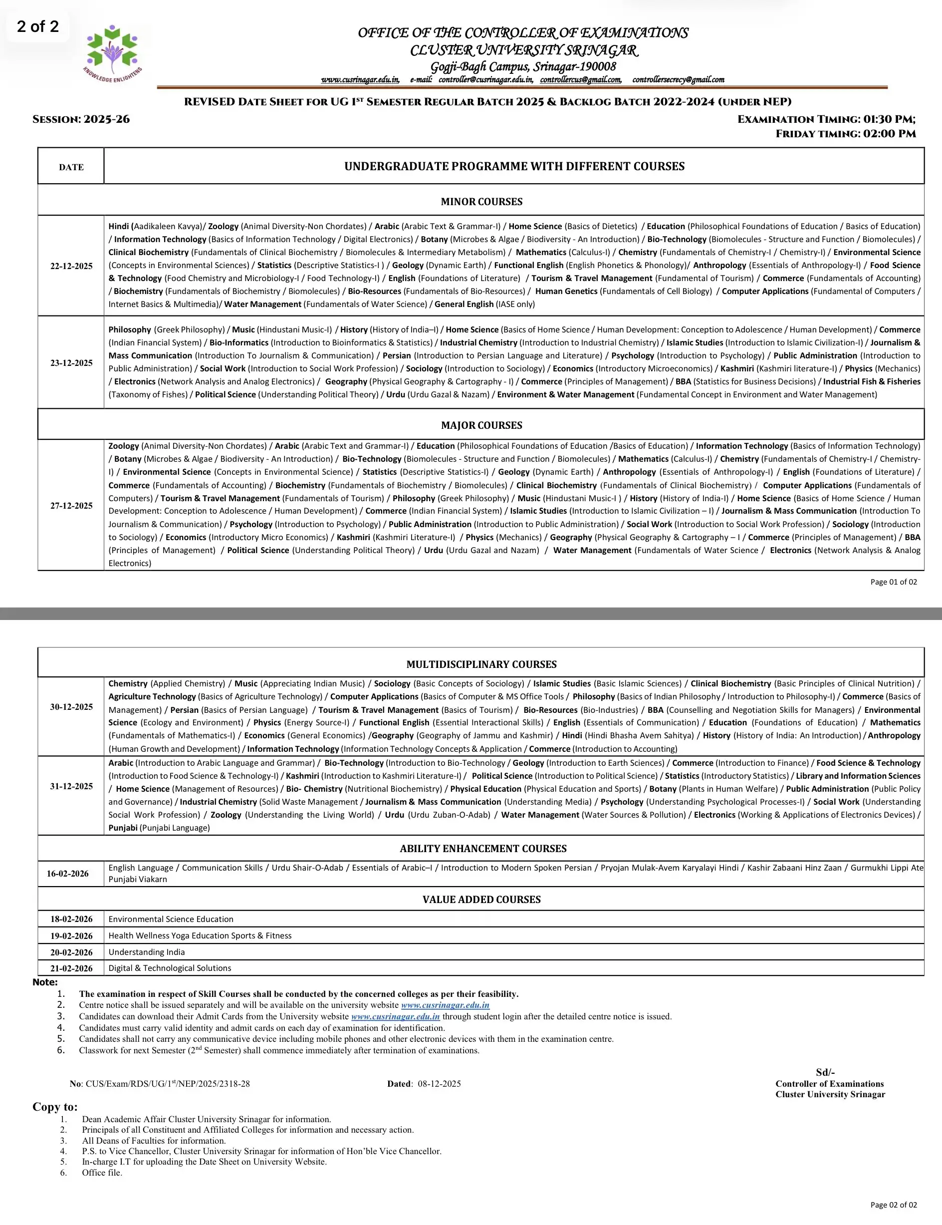 The Cluster University Srinagar released the Revised Date Sheet for the UG 1st Semester (NEP) Regular Batch 2025 & Backlog Batches 2022-2024 on December 8, 2025.