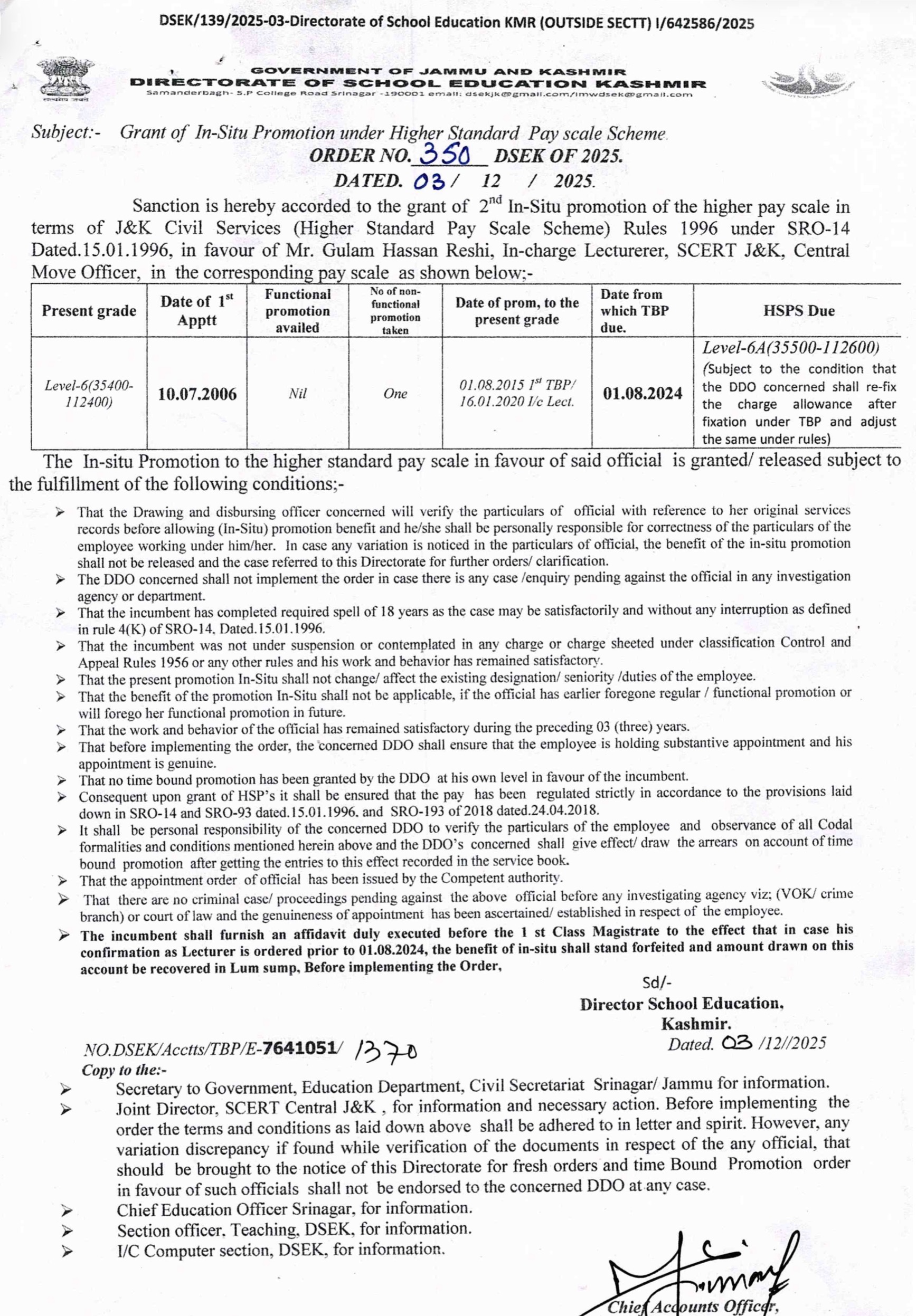 Official Quote: “Sanction is hereby accorded to the grant of 2nd In-Situ promotion… in favour of Mr. Gulam Hassan Reshi… subject to the fulfillment of the following conditions.”