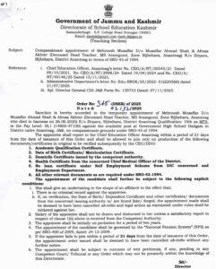 In an order issued today, December 2, 2025, the Directorate has approved the temporary appointment of Mehroosh Muzaffar as MTS (Multi-Tasking Staff) in the District Cadre Anantnag. This appointment is made against an available vacancy at Government High School, Dailgam, following the death of the appointee’s mother, who passed away while in service.