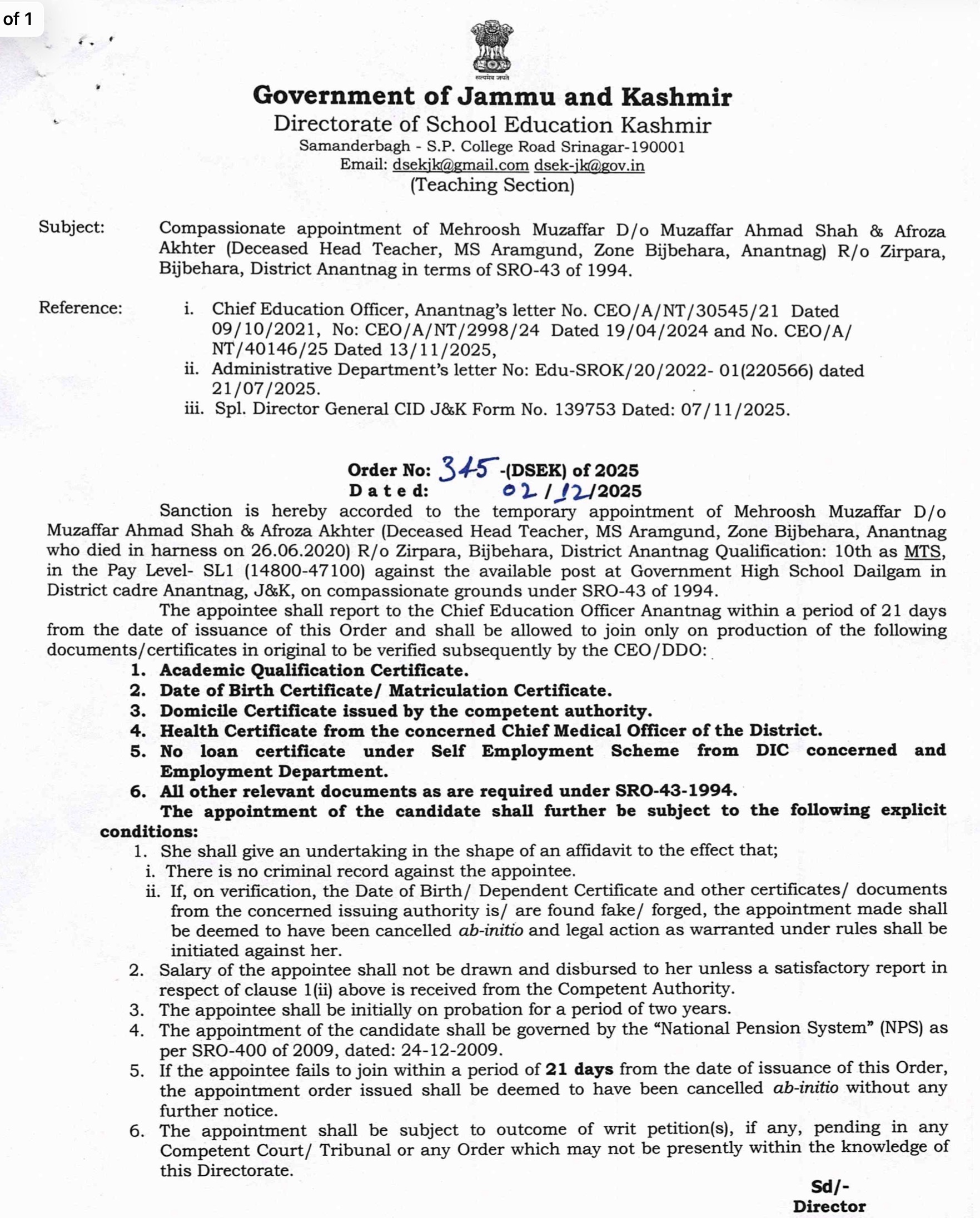 The Directorate of School Education Kashmir (DSEK) has issued a formal order sanctioning a compassionate appointment under the provisions of SRO-43 of 1994.