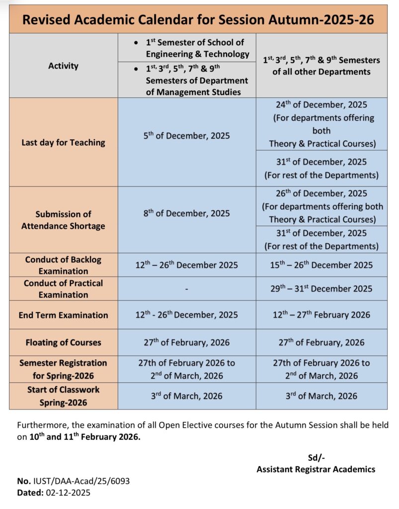 The Islamic University of Science and Technology (IUST), Awantipora, has issued a Revised Academic Calendar for the Session Autumn-2025-26. The notification, endorsed under No. IUST/DAA-Acad/25/6093 and dated December 02, 2025, outlines the critical dates for teaching, examinations, and registration for various departments, including the School of Engineering & Technology and the Department of Management Studies.
