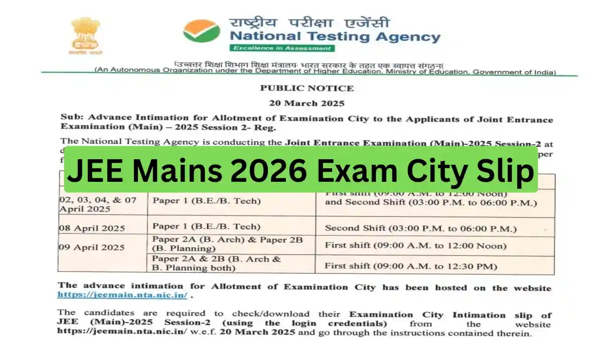 1 thought on “JEE Mains 2026 Exam City Slip: Session 1 Release Date, Direct Link & Steps to Download”