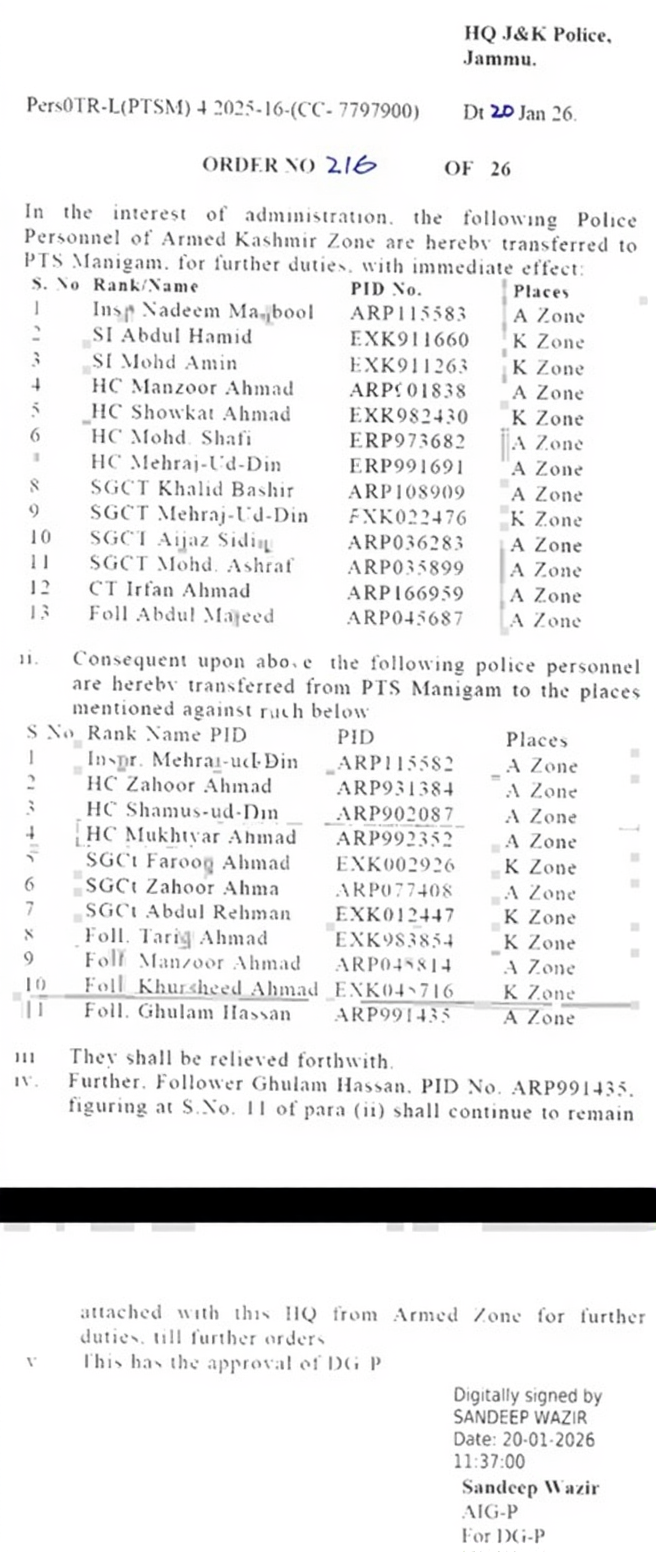 J&K Police orders transfers/postings 24 Police Officials including Inspector/Sub Inspectors