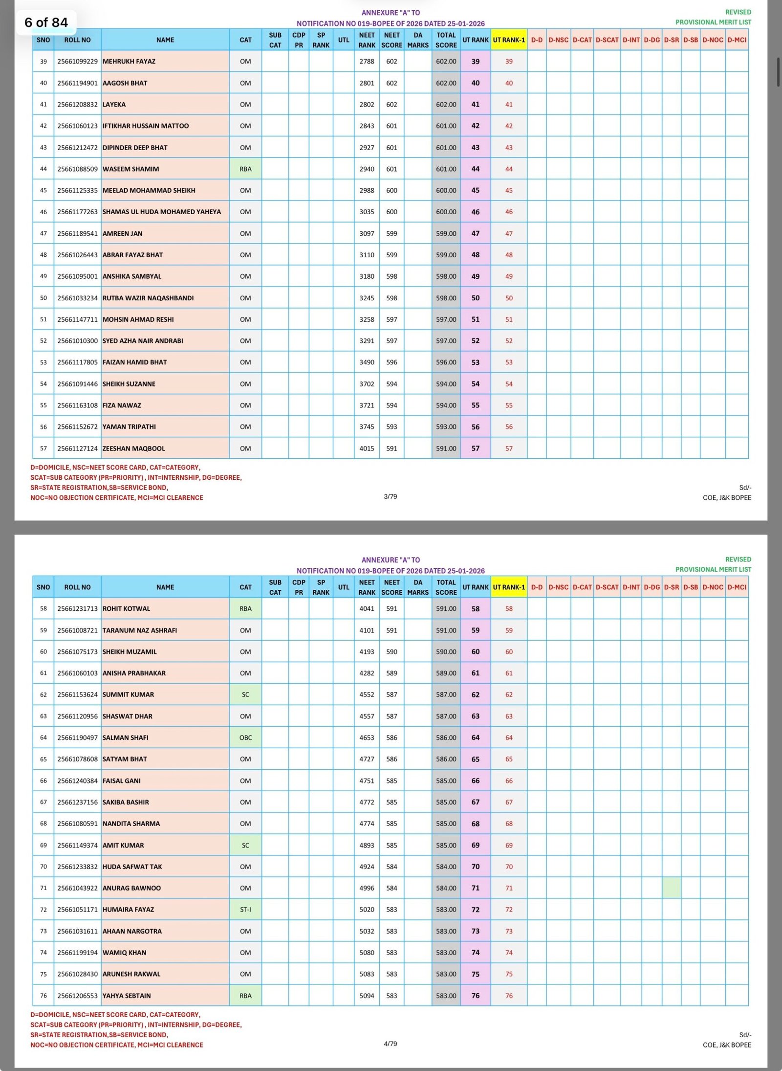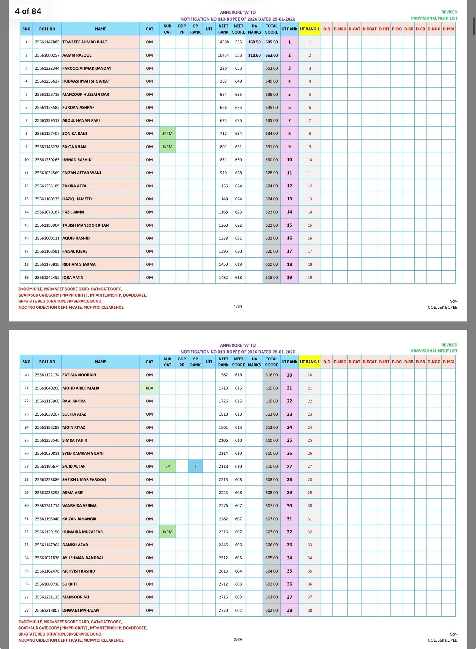 The Jammu and Kashmir Board of Professional Entrance Examinations (JKBOPEE) has issued the Revised Provisional Merit List for NEET PG (MD/MS/PG Diploma) Courses–2025 for candidates belonging to UTs of Jammu & Kashmir and Ladakh.
