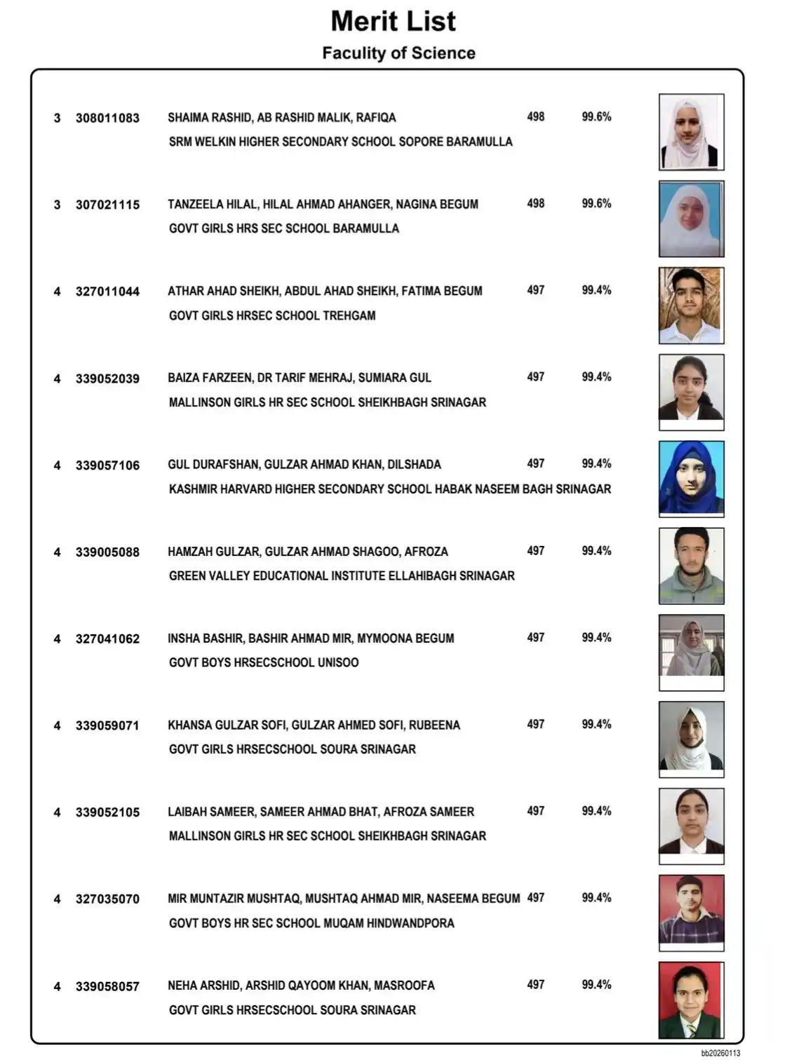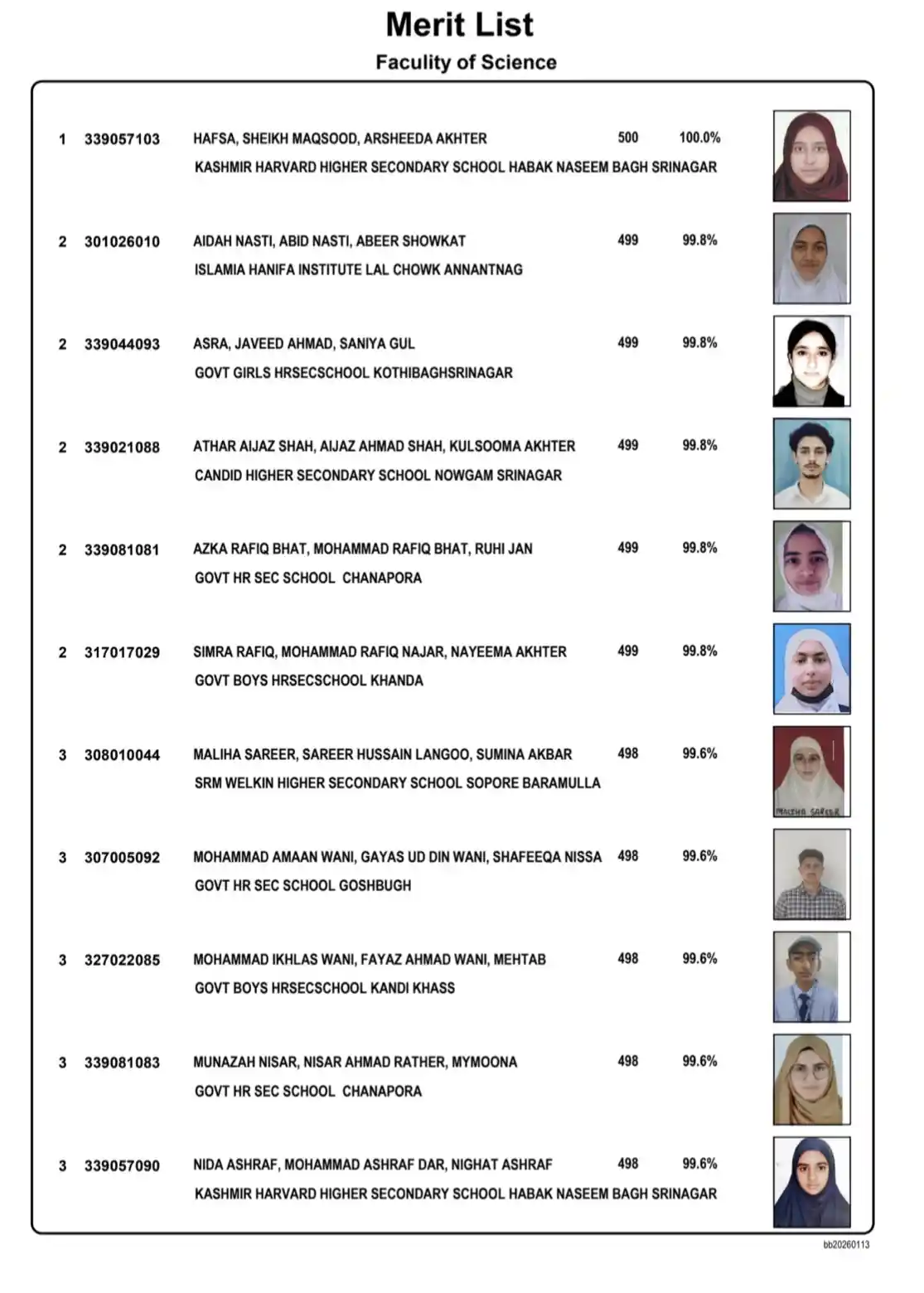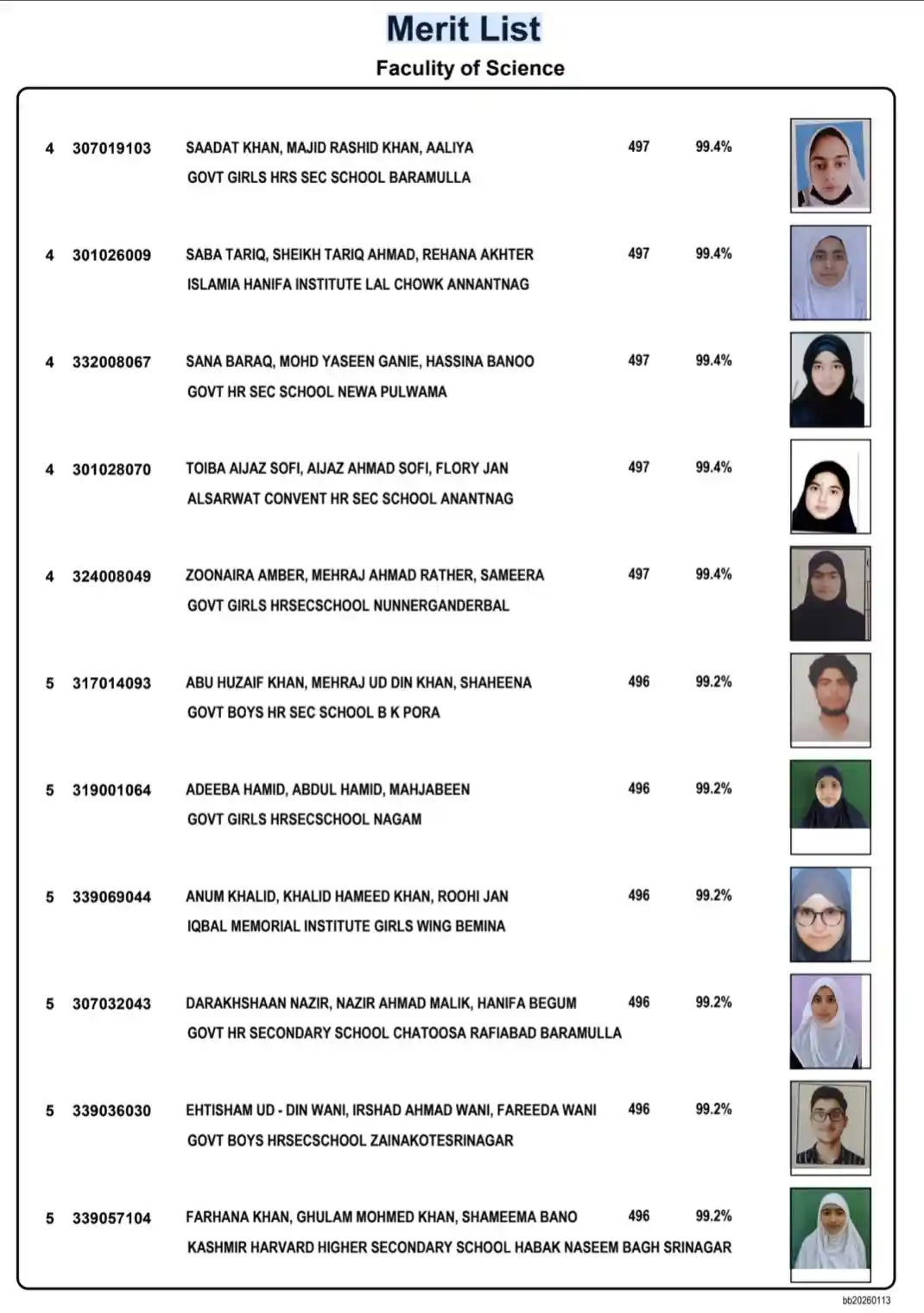 In the Home Science stream, all top three positions were secured by students from government schools. The first two positions were bagged by students of Government Higher Secondary School, Kothi Bagh, while the third position was secured by a student of Government Girls Higher Secondary School, Ranibagh, Anantnag.
