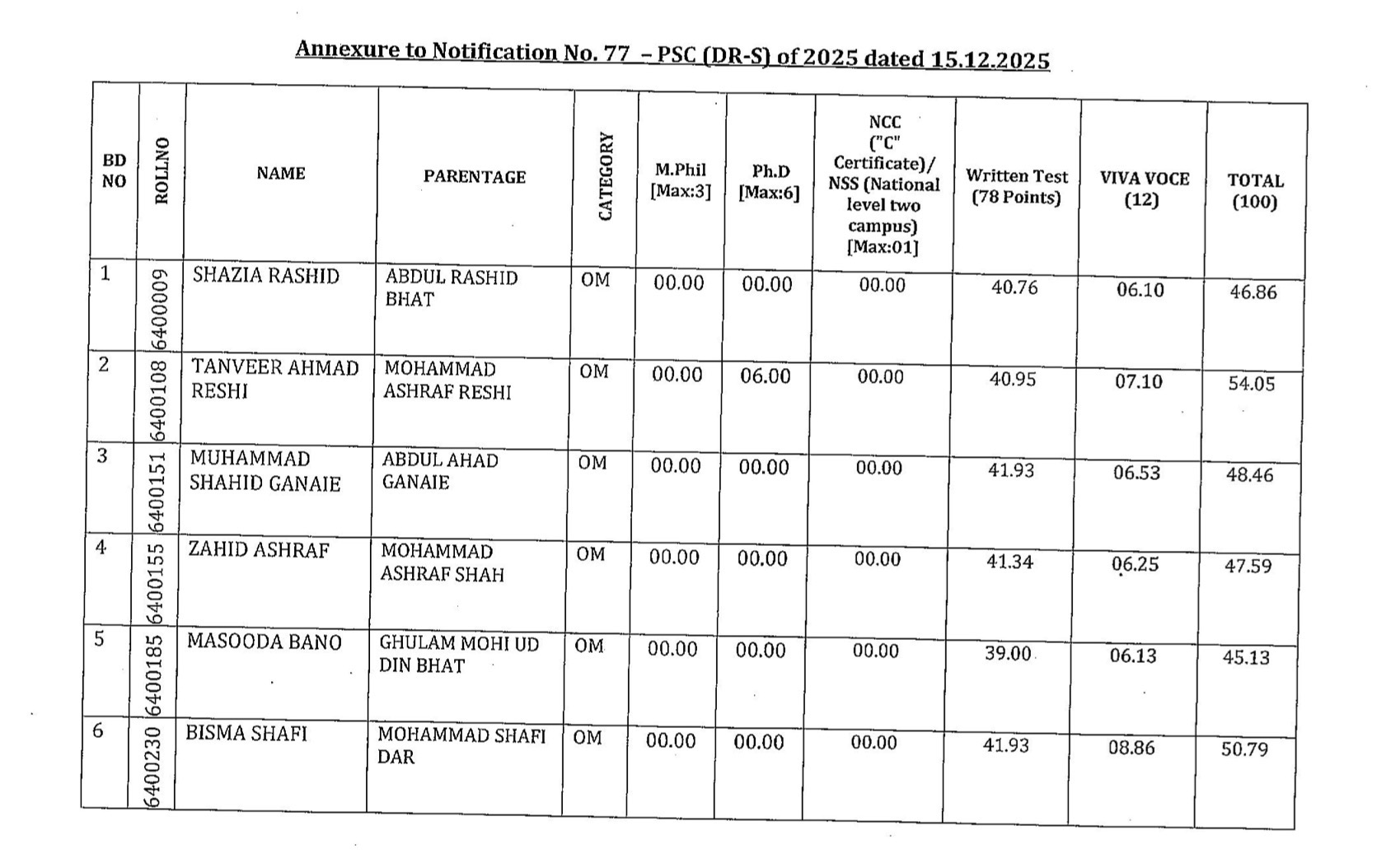 Vide Notification No. 77-PSC (DR-S) of 2025, dated 15.12.2025, the Commission announced the names of candidates selected based on their performance in the Written Test (conducted on 27.09.2025) and the Viva-Voce (conducted on 15.12.2025).