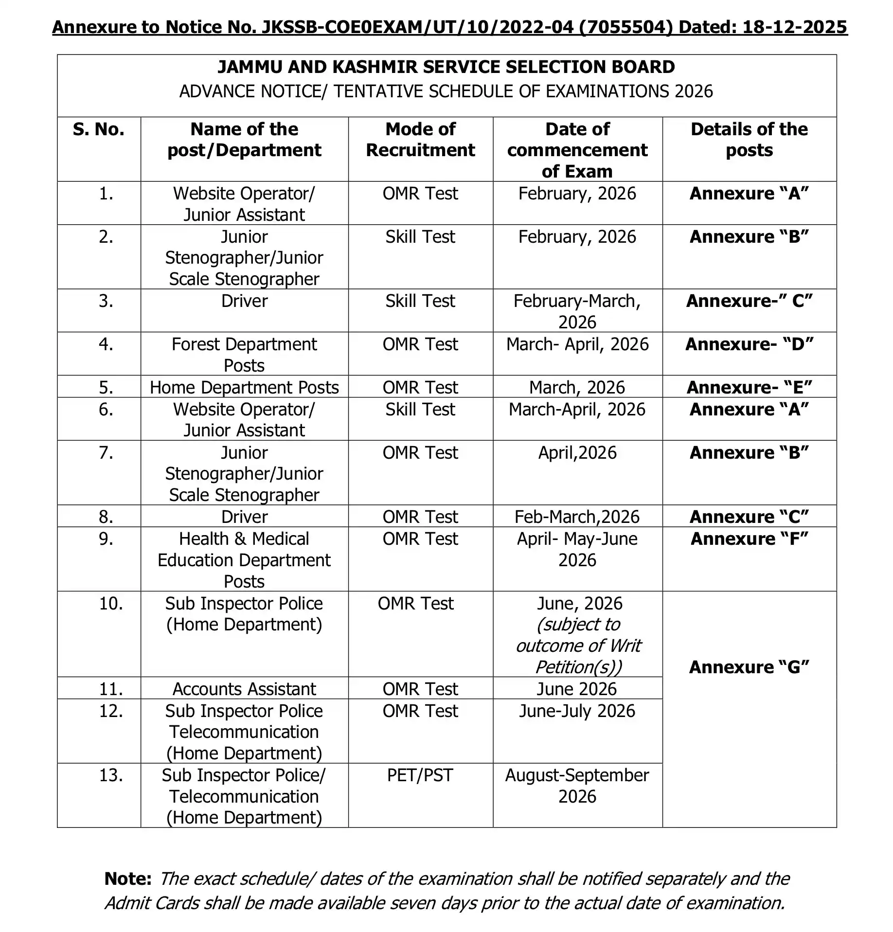 This release is a significant update for thousands of aspirants preparing for government jobs in J&K. Candidates are encouraged to download the Annexure (where available) to check the tentative months for their specific posts and align their study plans accordingly.