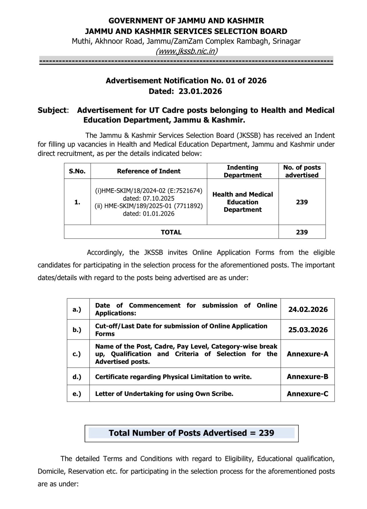The Jammu and Kashmir Services Selection Board (JKSSB) has released its first major advertisement of the year, Notification No. 01 of 2026, dated January 23, 2026.