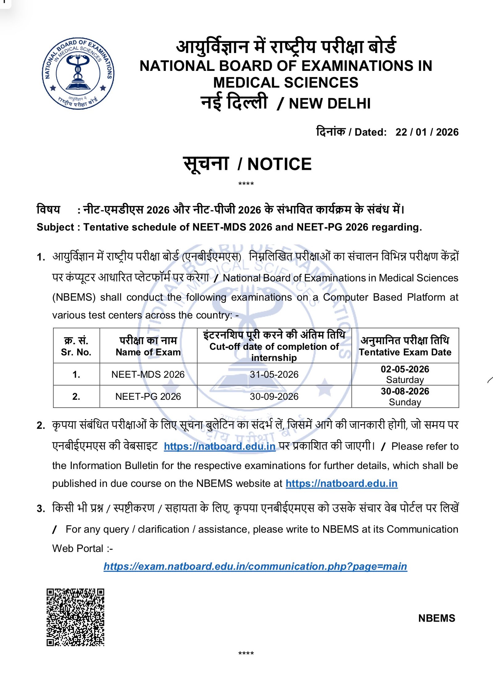 The National Board of Examinations in Medical Sciences (NBEMS) has officially released the tentative schedule for NEET-MDS 2026 and NEET-PG 2026. The notice was issued on 22 January 2026 from New Delhi, providing clarity to thousands of medical aspirants preparing for postgraduate entrance examinations. As per the official notification, both examinations will be conducted in Computer-Based Test (CBT) mode at various test centres across India.