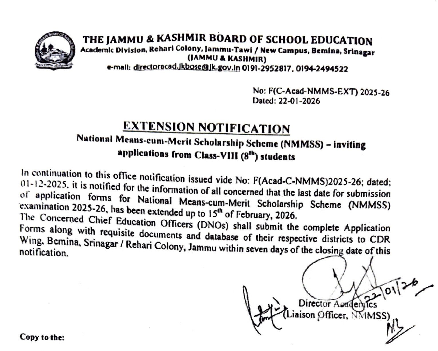 The Jammu and Kashmir Board of School Education (JKBOSE) has officially extended the last date for submission of application forms under the National Means-cum-Merit Scholarship Scheme (NMMS) 2025–26 for Class 8 (VIII) students.