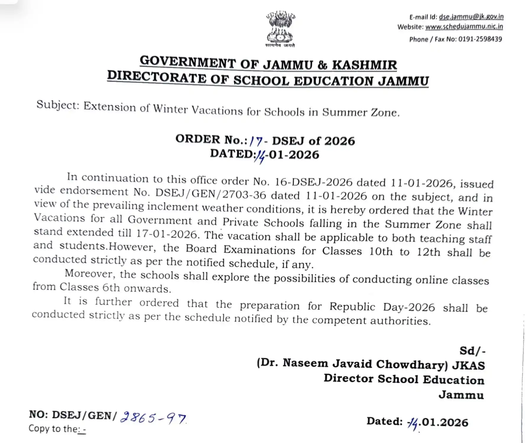 The order was issued and signed by Dr. Naseem Javaid Chowdhary (JKAS), Director of School Education, Jammu.